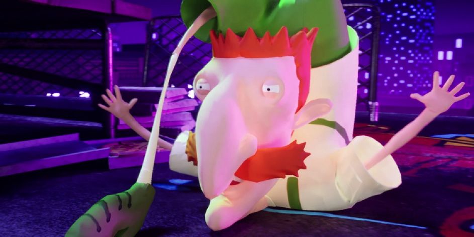 Lucy looks like she’ll have a unique moveset that revolves around teleportation and stealth, causing her to greatly stand out from the rest of the roster. Next up is Nickelodeon’s biggest mascot, Spongebob with his karate gear and trusty jellyfishing net, Helga Pataki from Hey Arnold! armed with a slingshot, and Reptar the giant Godzilla-like dinosaur from Rugrats. They take part in a four-player match at the Technodrome from Teenage Mutant Ninja Turtles, the graveyard that was seen earlier, and Jellyfish Fields from Spongebob Squarepants.
